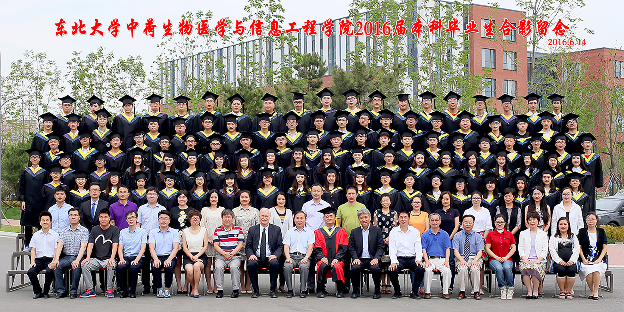 (通讯员 时英晋)6月14日上午9时,风轻云淡,草木葱茏,中荷学院2016届本科毕业生欢聚生命学馆门前举行毕业生合影活动。东北大学校长赵继教授、东软集团董事长刘积仁教授、中荷学院院长钱唯教授以及学院领导、老师来到现场与毕业生们合影留念,为即将踏上新征途的同学们送上祝福。
