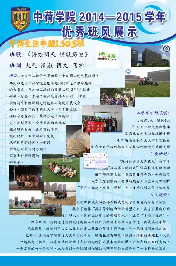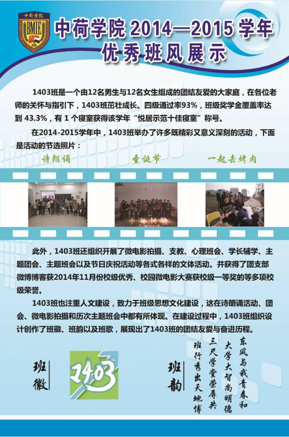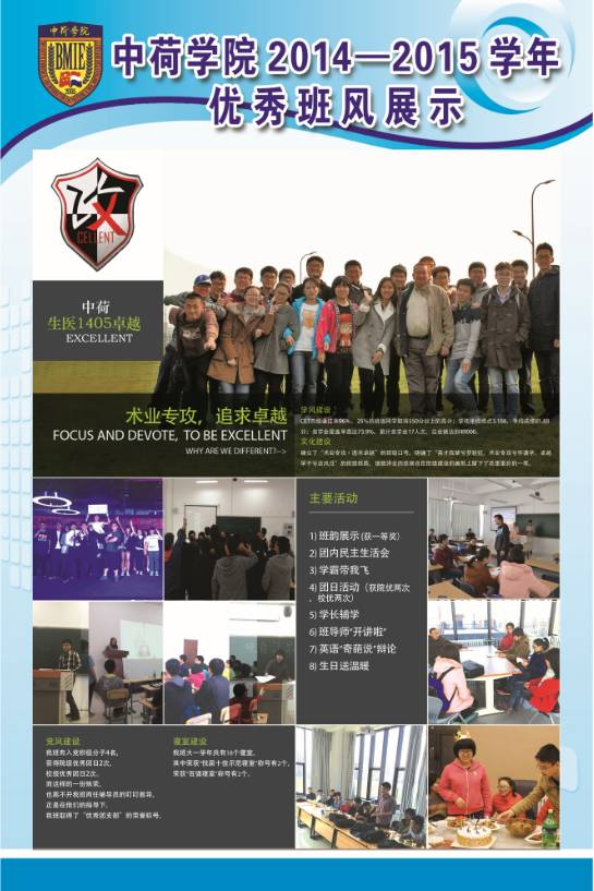 (通讯员 程俊龙)2015年11月—12月,中荷学院开展2014—2015学年先进班集体建设工作,并成功举办2014-2015学年先进班集体和特色班集体答辩会。在此基础上,为进一步巩固我院班集体建设成果,展示校院两级先进班级体优良班风,带动我院班集体向上发展,现将各班优秀班风进行展示。