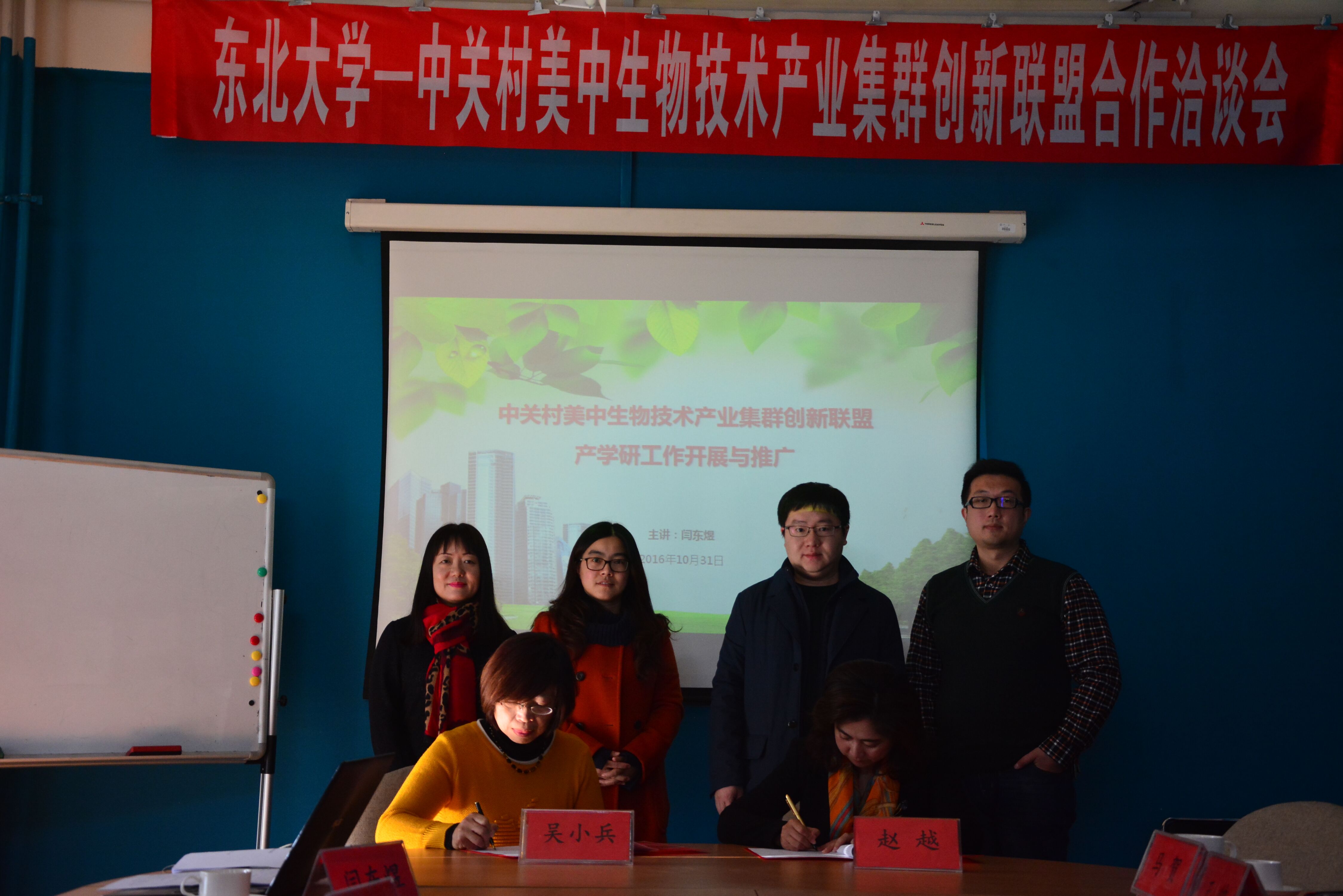 会上,赵越院长对吴教授一行的来访表示欢迎,并介绍了学院的基本情况、定位目标和办学特色,特别是 “产学研医”深度互动的发展模式,以及近年来学院在科研创新、国际合作、人才引进和培养等方面取得的成绩。吴小兵教授详细介绍了中关村美中生物技术产业集群创新联盟的基本情况和主要职能,并对联盟内移动健康、智慧医疗等相关产业的发展情况做了重点推介。随后,双方就学生实习实践平台建设、硕士研究生联合培养、科技成果转化和产业化等方面的话题进行了充分交流,表达了对下一步开展全方位合作的期待,并达成初步的合作意向。座谈会结束后,双方代表在战略合作协议上签字。