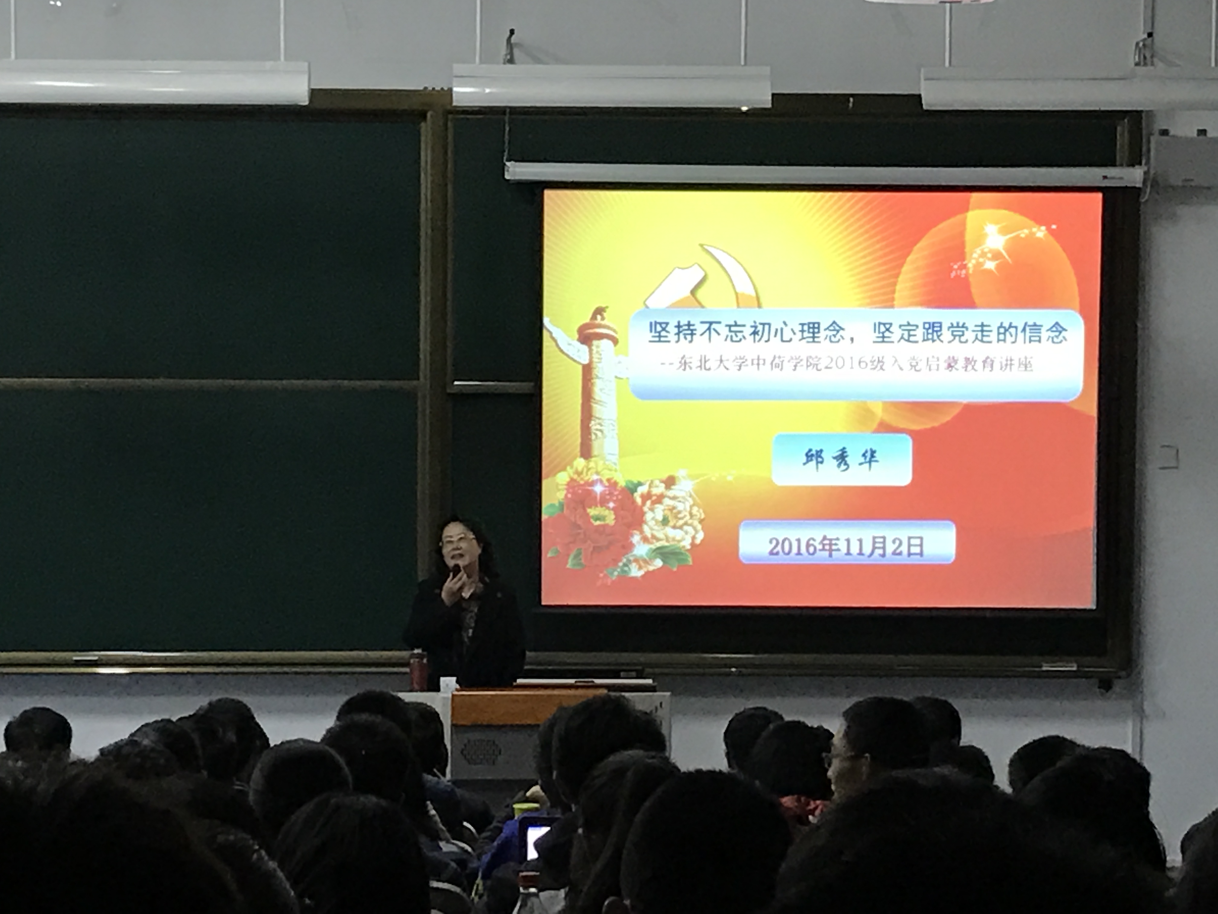 为加强大学生对中国共产党历史的深刻认识,鼓励学生树立坚定的理想信念,不断加强思想政治学习,积极向党组织靠拢,11月2日晚,中荷学院学生党总支在生科楼B201室组织举办了2016级新生入党启蒙教育活动,学院2016级本、硕新生和全体学生党员参与了此次活动。东北大学思想政治理论课主讲教师邱秀华教授受邀做专题报告,中荷学院党委书记兼副院长王帅,以及全体辅导员出席活动。