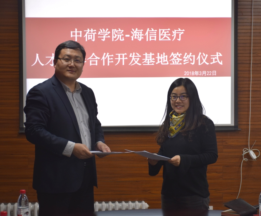 3月22日下午2时,东北大学中荷学院与青岛海信医疗设备股份有限公司在生命学馆B608室成功举办人才培养交流研讨会并签署人才培养合作开发基地协议。出席此次会议的有海信医疗总经理助理兼研发部部长陈永健、人力资源经理舒晨、毕业生代表王嘉博、中荷学院党委副书记兼副院长王帅、科研副院长马贺及各系教师代表。
