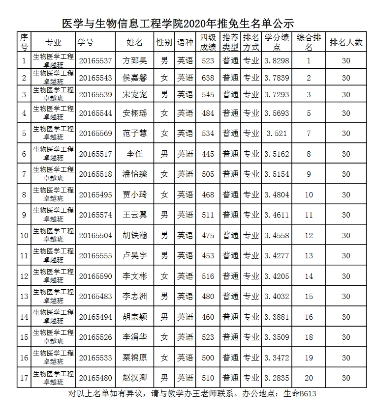 【医工学院推免名单公示】东北大学2020年推免生汇总表
