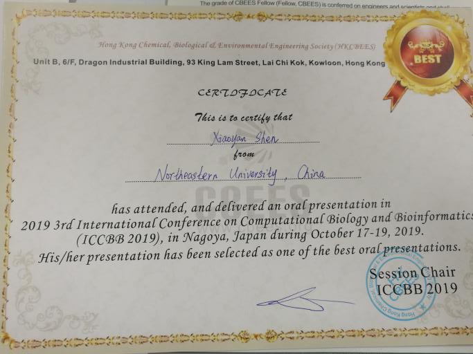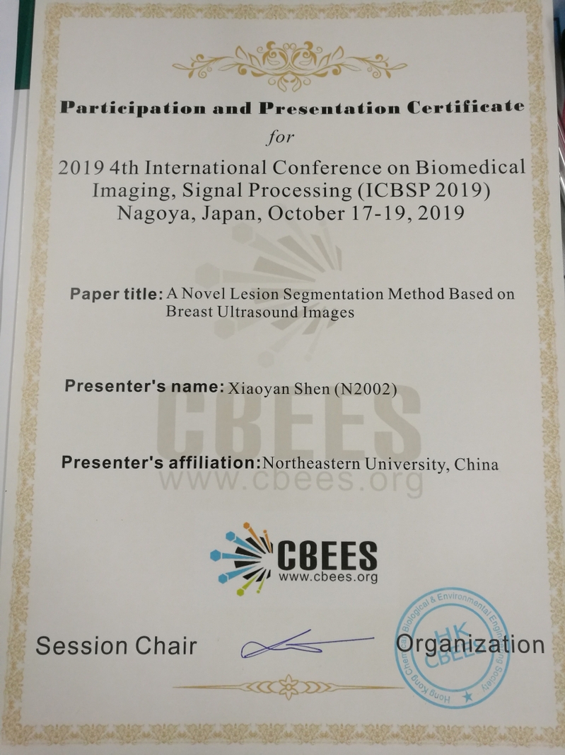 在刚刚结束的2019年第四届生物医学成像与信号处理国际会议(ICBSP 2019)上,我院在读博士生沈晓燕作了题为“A Novel Lesion Segmentation Method based on Breast Ultrasound Images”的口头报告,并荣获小组最佳口头报告奖。我院学生参加此项会议并首次获奖,促进和推动了生物医学研究领域内各学科在国际范围内的广泛学术交流,扩大了东北大学在生物医学图像及信号处理领域的国际影响力,也同时加强了学院宣传度。