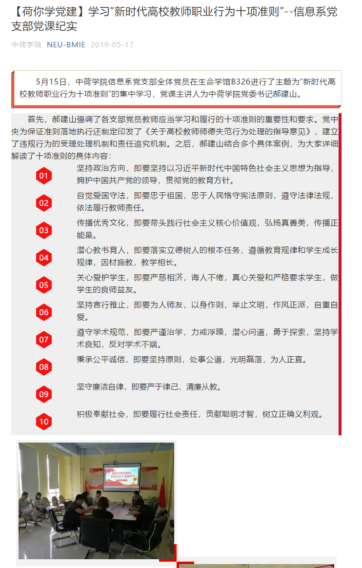 医学与生物信息工程学院生物医学信息学系党支部于2019入选东北大学特色支部创建工作名单。从建设初期开始,支部全体党员坚持以习近平新时代中国特色社会主义思想为指导,以落实“立德树人”根本任务和助力学校一流大学建设工作为己任。为了适应学校党的基层组织建设面临的新形势和新任务,党支部在党建工作和党日活动中不断探索新方法、总结新经验,逐渐归纳出“一条主线,四项工程”的支部党建特有模式。“一条主线”指党建活动内容坚持紧密围绕生物医学工程的专业特色,围绕医工融合发展的核心主题开展;“四项工程”指在规划具体活动时,分别从规范模范工程、凝心塑神工程、奉献服务工程和立功创业工程这四个层面落实。先后组织了“医工融合促发展”、“医工知识扶贫”等系列活动,逐渐形成了组织生活常态化、规范化,党员思想坚定化、统一化,组织活动多样化、创新化,建设成效鲜明化、实质化的支部建设特点。