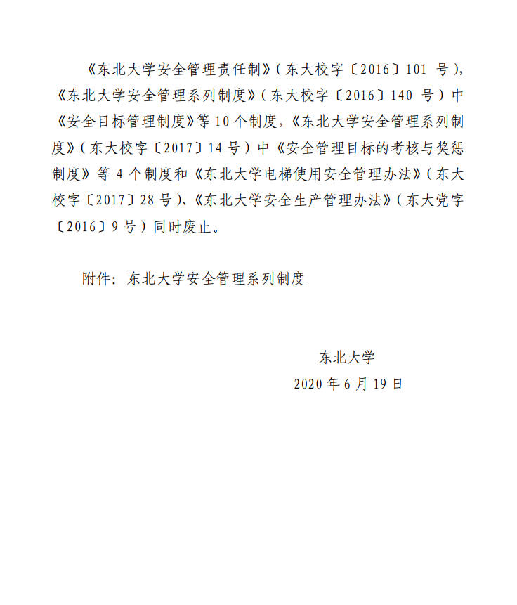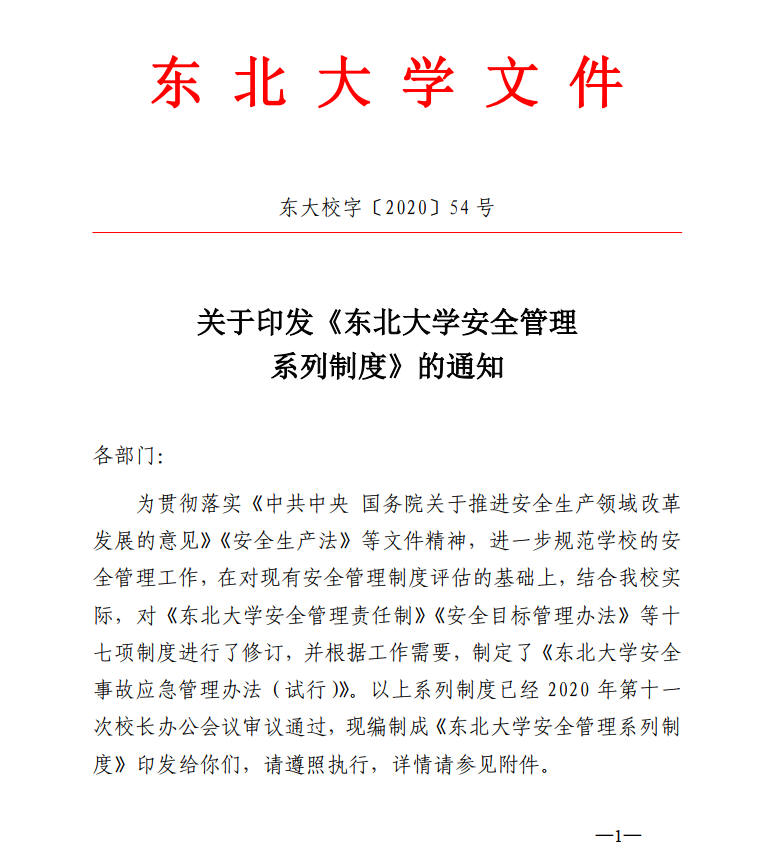 关于印发《东北大学安全管理系列制度》的通知【东大校字〔2020〕54号】