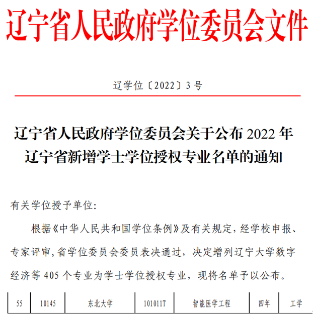 日前,辽宁省人民政府学位委员会发布《关于公布 2022 年 辽宁省新增学士学位授权专业名单的通知 》(辽学位〔2022〕3 号 ),经学校申报、专家评审,省学位委员会委员表决通过,我院智能医学工程专业获批为学士学位授权专业 。