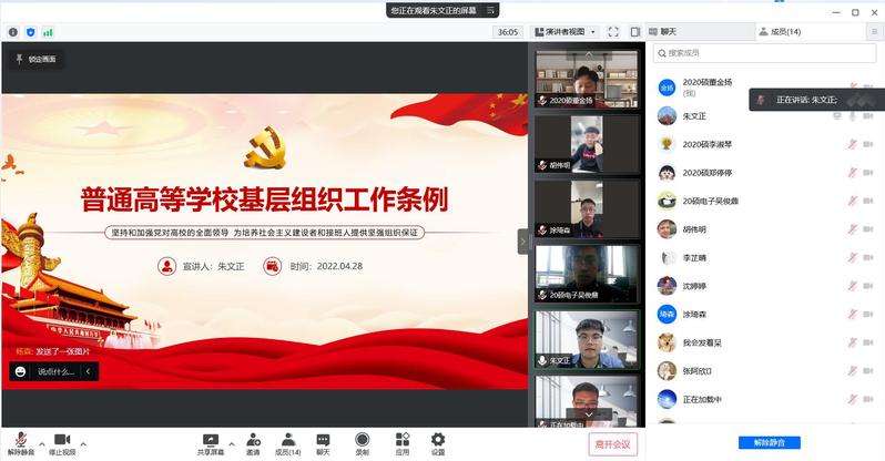 本次党日活动主要围绕《中国共产党普通高等学校基层组织工作条例》(以下称“《条例》”)开展,朱文正首先介绍了《条例》的背景意义和过程,《条例》全面贯彻了党的教育方针,落实立德树人的根本任务,对建设高质量的教育体系,培养社会主义建设者和接班人具有重要意义。其次,讲解了《条例》的贯彻和落实要求,从各级党组织和各地各有关部门和高校入手,要展开学习培训,加强监督检查。随后,讲述了新时代高校党的建设的基本遵循,并对《条例》的内容逐条学习解读,强调学生党支部应当加强思想政治引领,筑牢学生理想信念根基,引导学生刻苦学习、全面发展、健康成长。