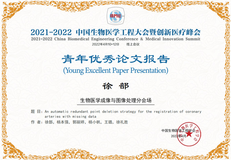 医工学院电子学系博士生徐部同学凭借论文《An automatic redundant point deletion strategy for the registration of coronary arteries with missing data》在“2021-2022中国生物医学工程大会暨创新医疗峰会 (BME2021-2022)”上获得青年学者组的“青年优秀论文报告”。目前,冠脉疾病位居世界致死性疾病的首位。不同期相间的冠脉配准能帮助研究冠脉运动与冠脉疾病之间的关联性、辅助医生进行心血管疾病的诊断。本文提出了一种自动的冗余点删除策略,以解决在配准过程中冠脉末端出现的缺失点问题。根据配准参数的选择,将配准过程分为粗配准和细配准两个部分。基于粗配准结果,利用血管树上点之间的角度信息以自动地识别血管树的端点。将两个血管树对应端点间的距离作为半径生成距离球,判断并删除距离球中的冗余点。冗余点删除后,进行细配准操作,进而完成整个配准过程。所提出的删除策略能够获得更小的豪斯多夫距离,证明了其可行性和有效性。