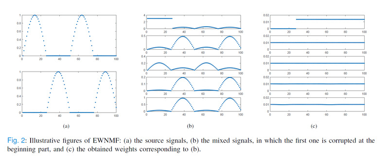非负矩阵分解(NMF)已被广泛用于学习数据的低维表示。然而,NMF方法在分解时,把所有数据点的所有属性都赋予了同等重要的地位,这不可避免地导致了不准确的表达。例如,在人脸数据集中,如果一张图像的头部含有一顶帽子,则应在矩阵分解过程中移除帽子或降低其相应属性的重要性。滕月阳老师团队提出了一种新型的NMF方法,称为熵加权NMF(Entropy weighted NMF,EWNMF)方法,它对每个数据点的每个属性使用可优化的权重来表示其重要性,然后在目标函数中加入熵正则化项反映权重的不确定性,最后使用拉格朗日乘数法获得权重的迭代解。实验结果证明了所提方法的可行性和有效性。