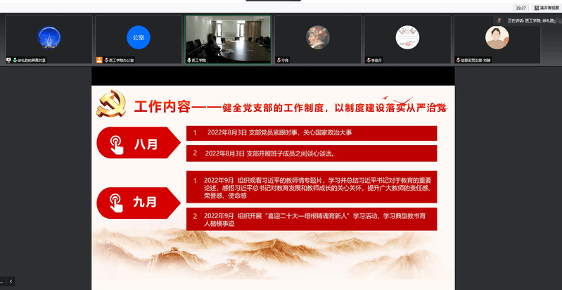 生物医学影像学系党支部、机关党支部、生物医学电子学系党支部、2021级硕士生党支部、2022级硕士生党支部、本科生党支部就近阶段支部开展的常态化工作和特色工作进行了经验交流,并对下一步工作开展做了规划。