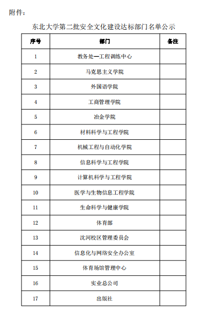 学校组织的第二批安全管理标准化达标验收工作中,经安委会办公室、安全督查组、校内外安全管理专家组成的安全文化建设达标验收工作组的严格评审,学院被确定为东北大学安全管理标准化达标部门。