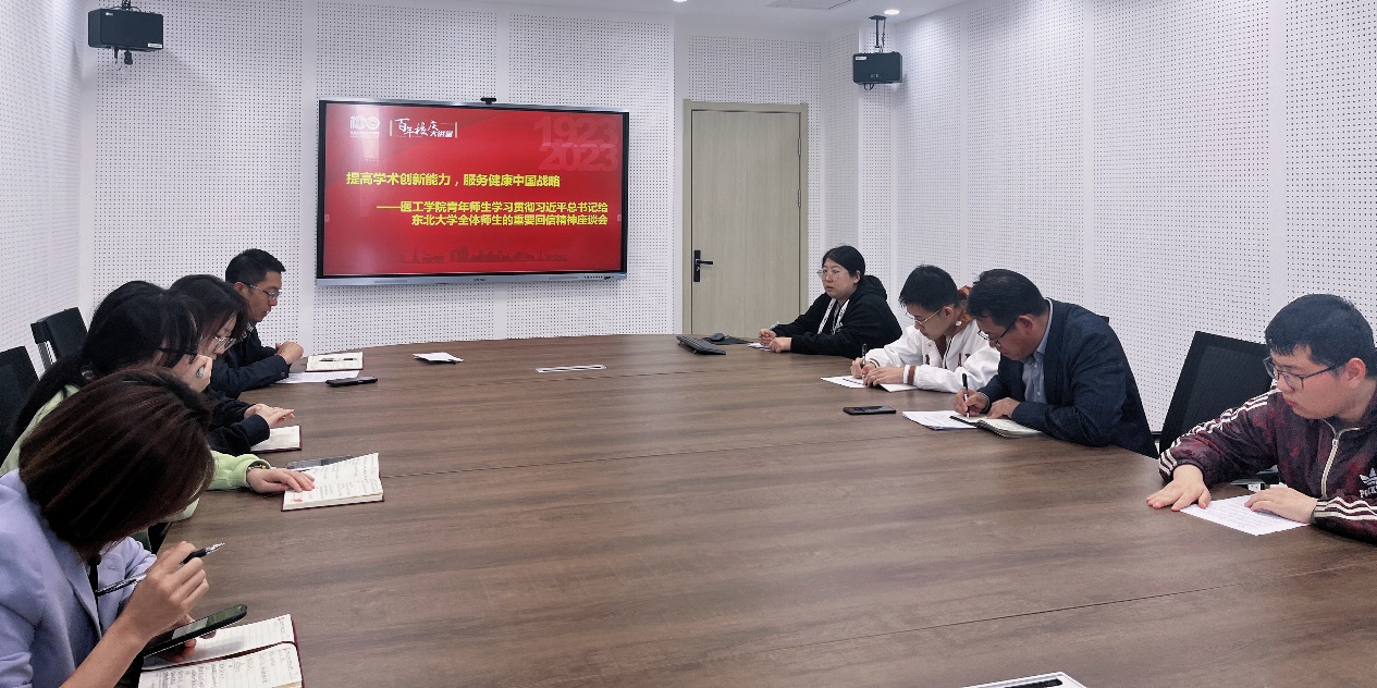 10月18日,医学与生物信息工程学院党委组织召开“提高学术创新能力,服务健康中国战略——医工学院青年师生学习贯彻习近平总书记给东北大学全体师生的重要回信精神”座谈会,学院青年教师代表、博士生代表、硕士生代表等近二十人参加了座谈会。
