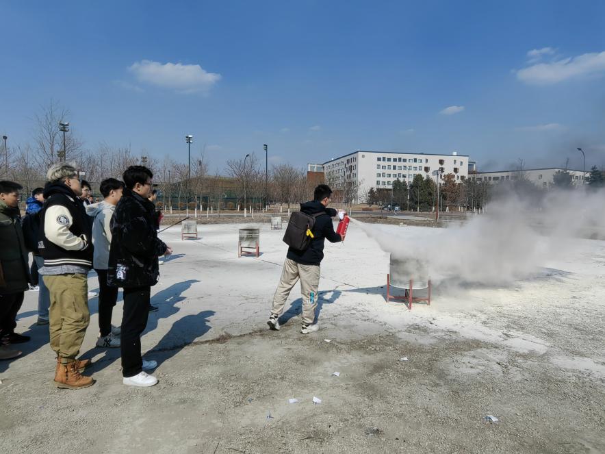 随后,校公安处老师向师生们介绍了墙壁消火栓水带连接方法,并演示了如何使用干粉灭火器扑救初期火灾,在校公安处老师的指导下,师生们积极体验灭火器材的实际操作,并完成了对初期火灾的模拟扑救。