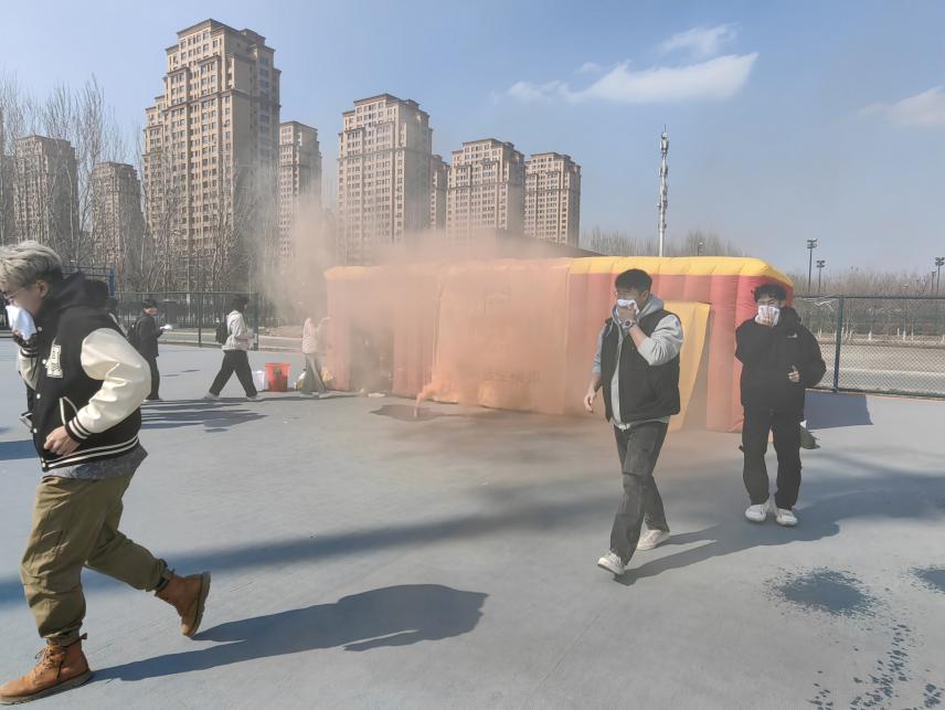 火警信号响起,烟雾散开,在现场工作人员的引导下,师生用湿毛巾蒙住口鼻,降低重心,附身向下分别通过消防逃生舱,整个过程中,师生始终保持冷静并按照疏散预案有条不紊地撤离现场。