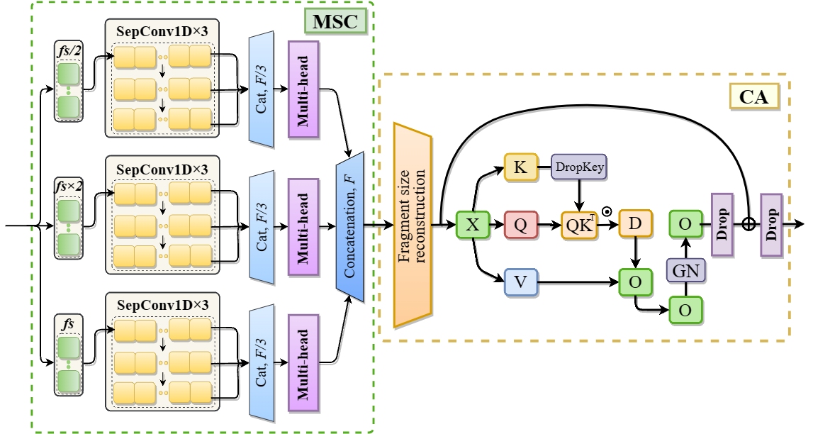 图2.所提方法的流程图,包括片段关联方法、内部特征提取模块MSC和上下文感知器CA